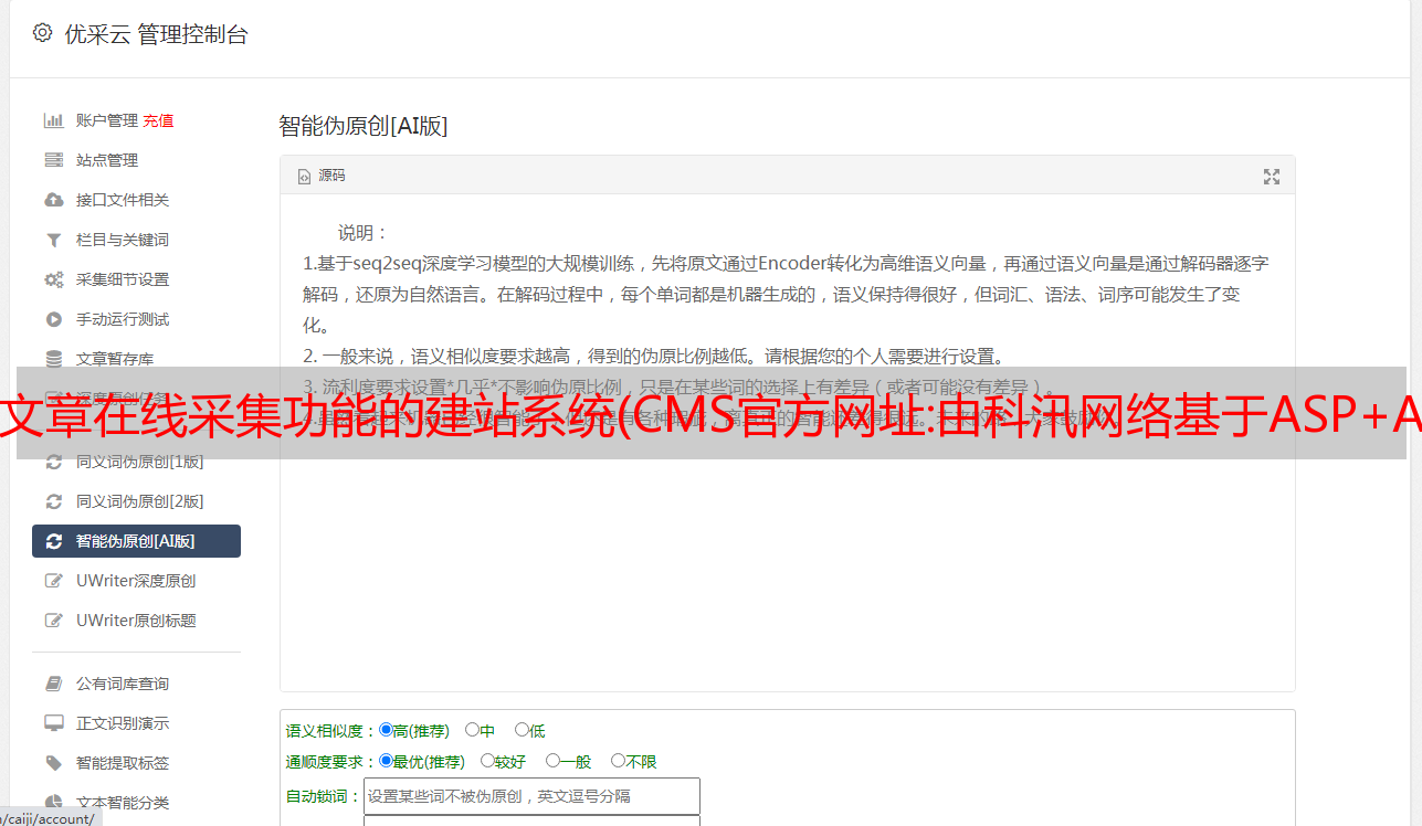 优采云 发布时间: 2021-10-15 21:15文章在线采集功能的建站系统(CMS官方网址:由科汛网络基于ASP+Access技术开发/MSSQL技术开发)
