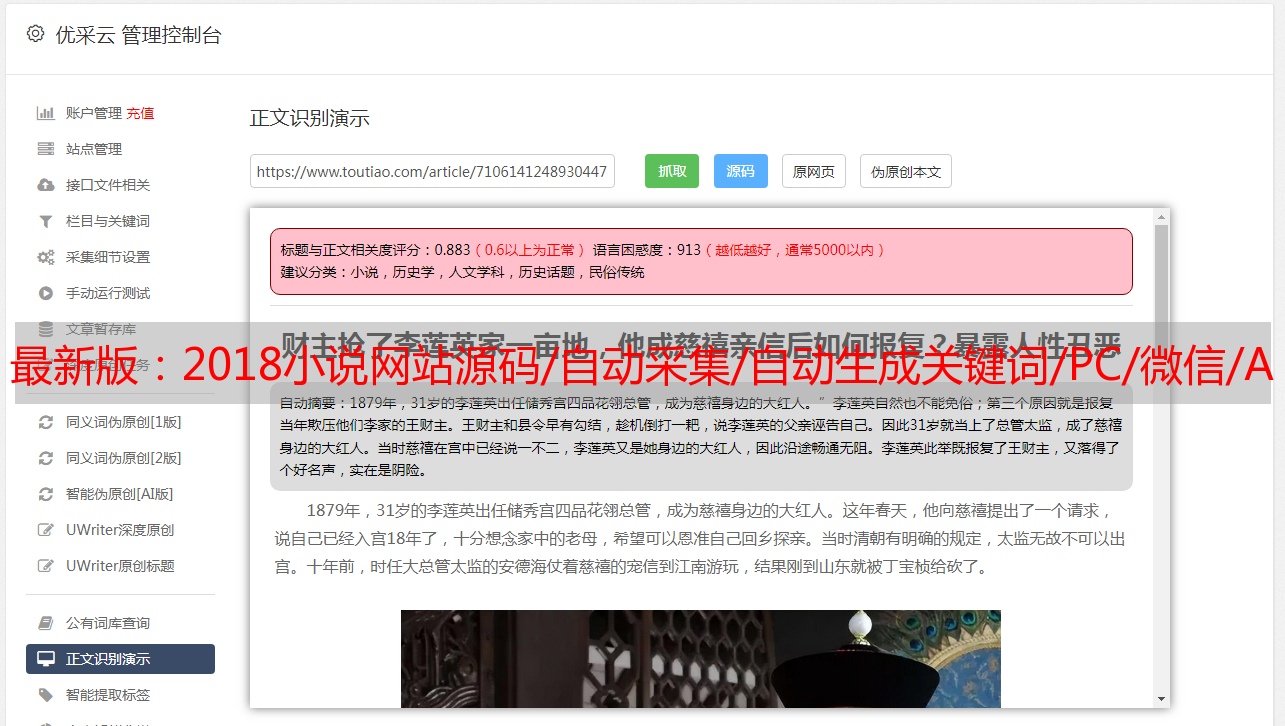 优采云 发布时间: 2020-12-18 09:47最新版:2018小说网站源码/自动采集/自动生成关键词/PC/微信/APP转码/txt下
