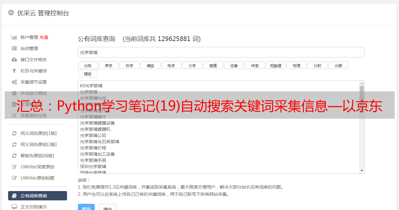 优采云 发布时间: 2020-12-21 08:12汇总:Python学习笔记(19)自动搜索关键词采集信息—以京东为例