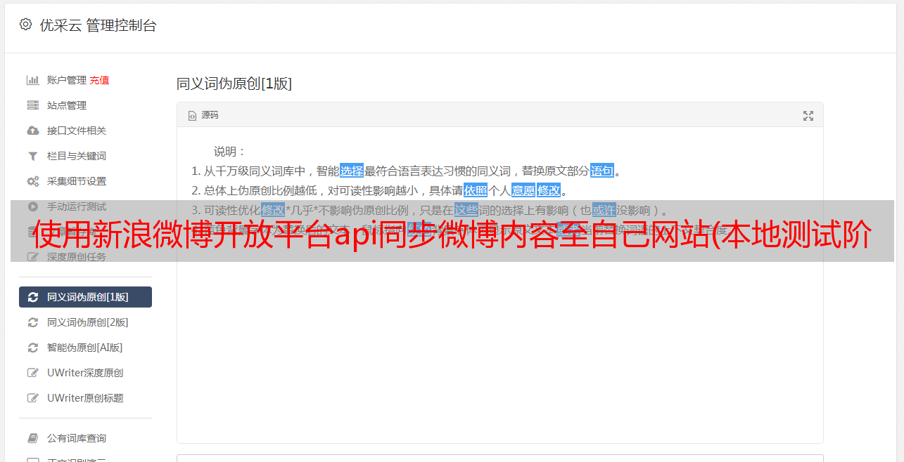 优采云 发布时间: 2021-10-23 02:11使用新浪微博开放平台api同步微博内容至自己网站(本地测试阶段如何申请后面讲述WAP网站提供两种验证方式)