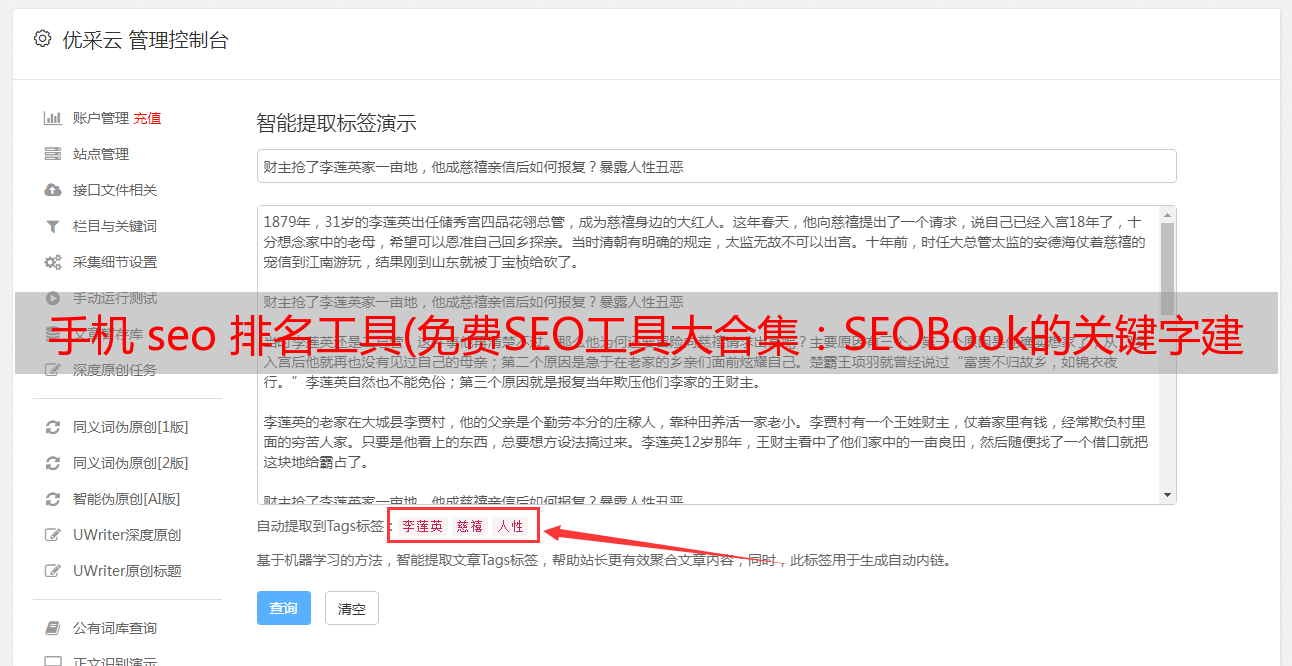 优采云 发布时间: 2021-10-23 18:11手机 seo 排名工具(免费SEO工具大合集:SEOBook的关键字建议工具费用)