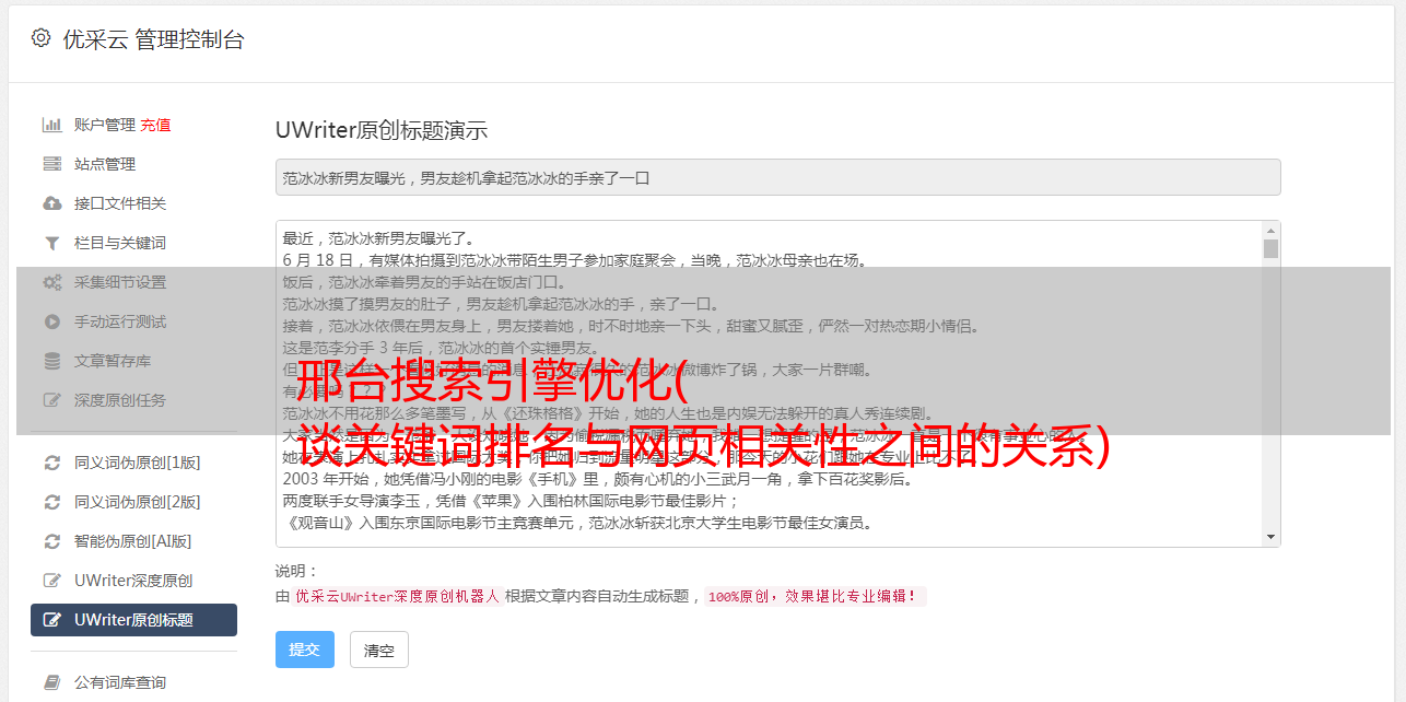 用户需要内容的原因,用户可以通过输入长尾词更准确地找到自己需要的内容。两种方法之一是关键词在文本中的重要性主要包括在出现次数上是否有特殊标记等,比如标题中的相关性明显大于文本中的相关性。二是超链接分析。如果有很多相关页面以相关关键词作为锚文本链接到这个页面,那么搜索引擎会认为这个页面会与关键词相关并给出一个很好的排名。不过现阶段,中国搜索世界我觉得显然是缺乏客观性,所以搜索引擎也会更多地使用其他条件来辅助或者提高知道相关性重要性的重要性,那么如何根据搜索引擎的特点提高网站的相关性呢?网站内容的相关性可以围绕网站这个主题展开。通过内部链接的相互调用,可以将内容和内容的相关性串联起来。例如,可以将相关内容组合成A话题,然后通过不断调整网站内容主题栏目页面的相关性,将话题和话题组合成相关话题,提高网站的SEO竞争力@> 页面。二、关注网站 Relevance的外部链接。外部链接也是优化的重要因素。基本上每个网站都会经常和其他网站交换友情链接。很多人交换链接,关注对方网站页面级别索引的级别。忽略链接的相关性和网站的更新频率