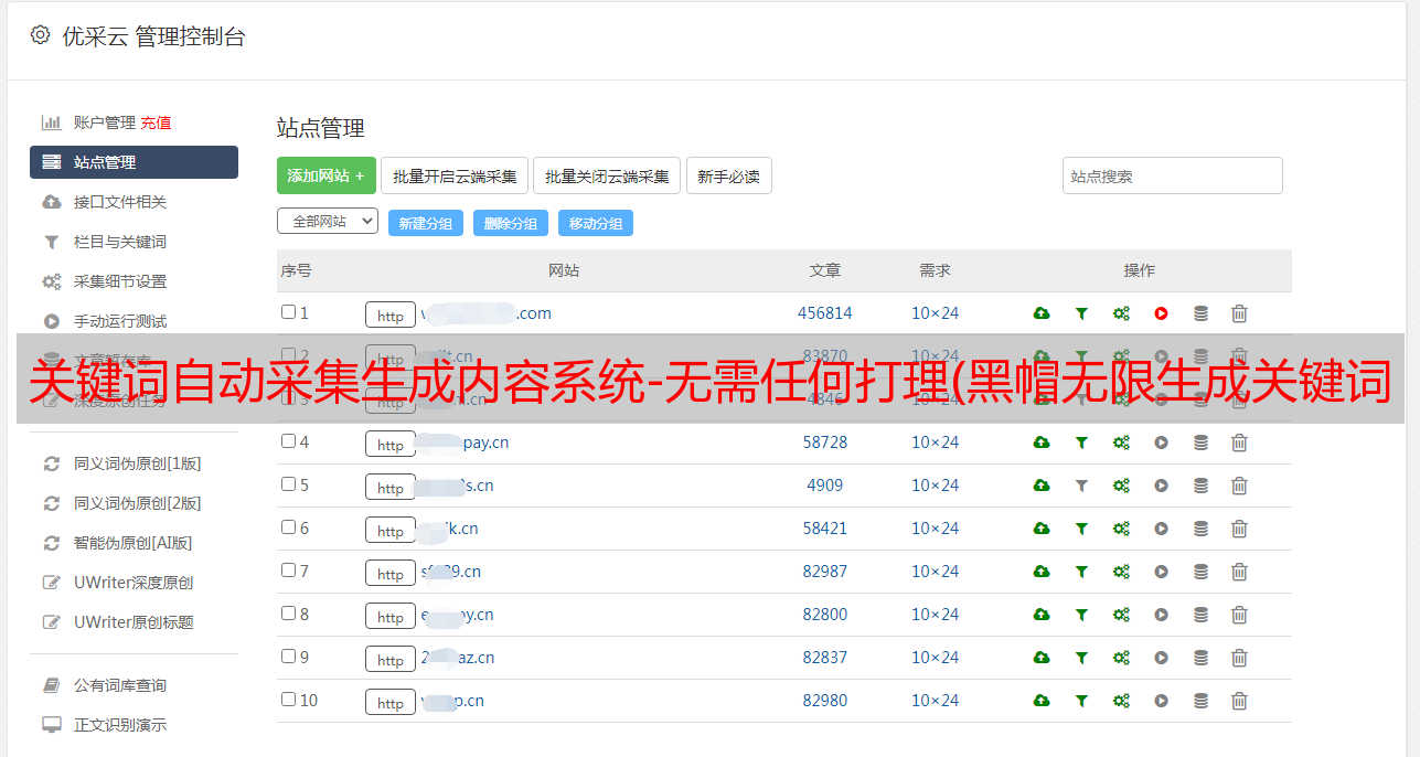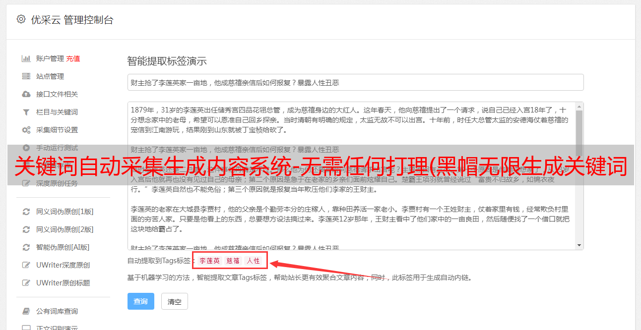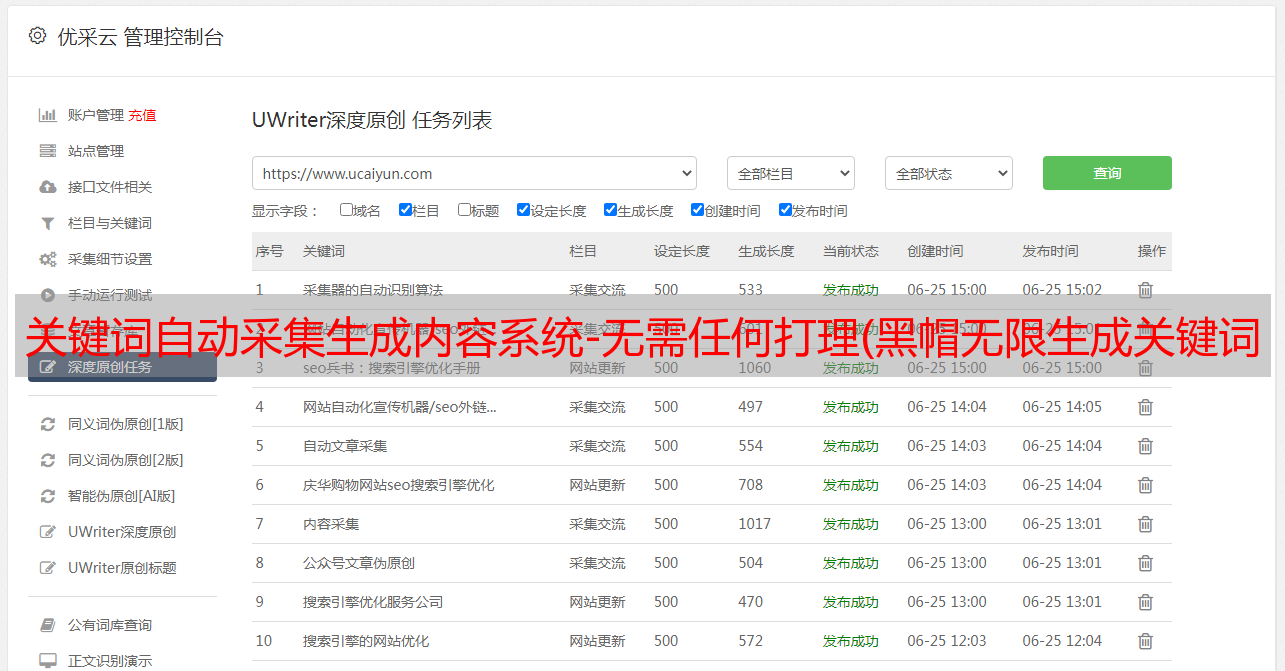 优采云 发布时间: 2021-10-26 01:06关键词自动采集生成内容系统-无需任何打理(黑帽无限生成关键词页面用内容页来做黑帽SEO优化)