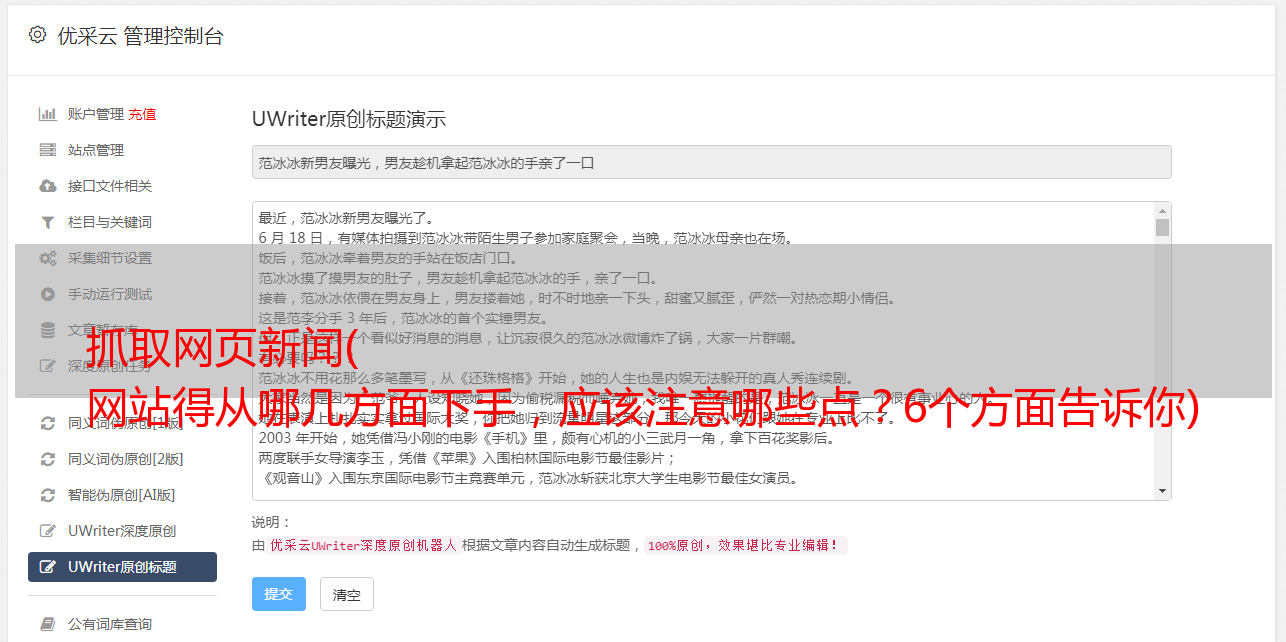 内容为王是不变的真理。网站文章的好坏可以决定网站优化效果的高低;百度蜘蛛每天都来你的网站,只为拦截到好东西;高质量的原创文章是他的最爱;对于原创文章,需要注意的是文章的内容是时效性和用户价值的;你需要小说标题;同时文章一定要定期更新,百度也会有时间抓拍你的网站内容。