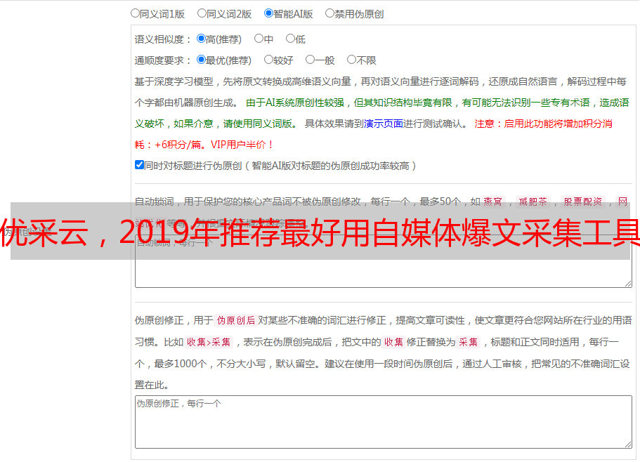 AI 伪原创,建议先执行原创测试,然后根据测试结果对其进行修改,并尽量不要更改原创句子。此功能非常易于使用,媒体帮派建议每个自媒体人都可以采集它。