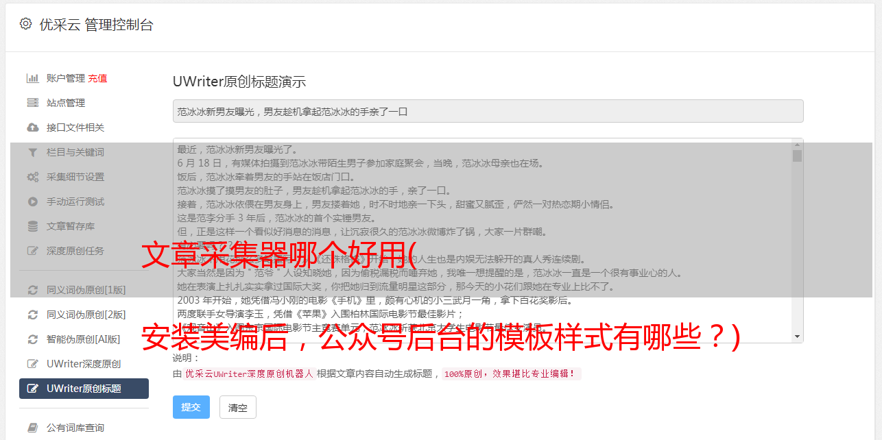主要提供“原创检测”、“内容纠错”、“文章素材”、“多账号管理”、“多平台内容一键分发支持视频”等功能“数据统计”。