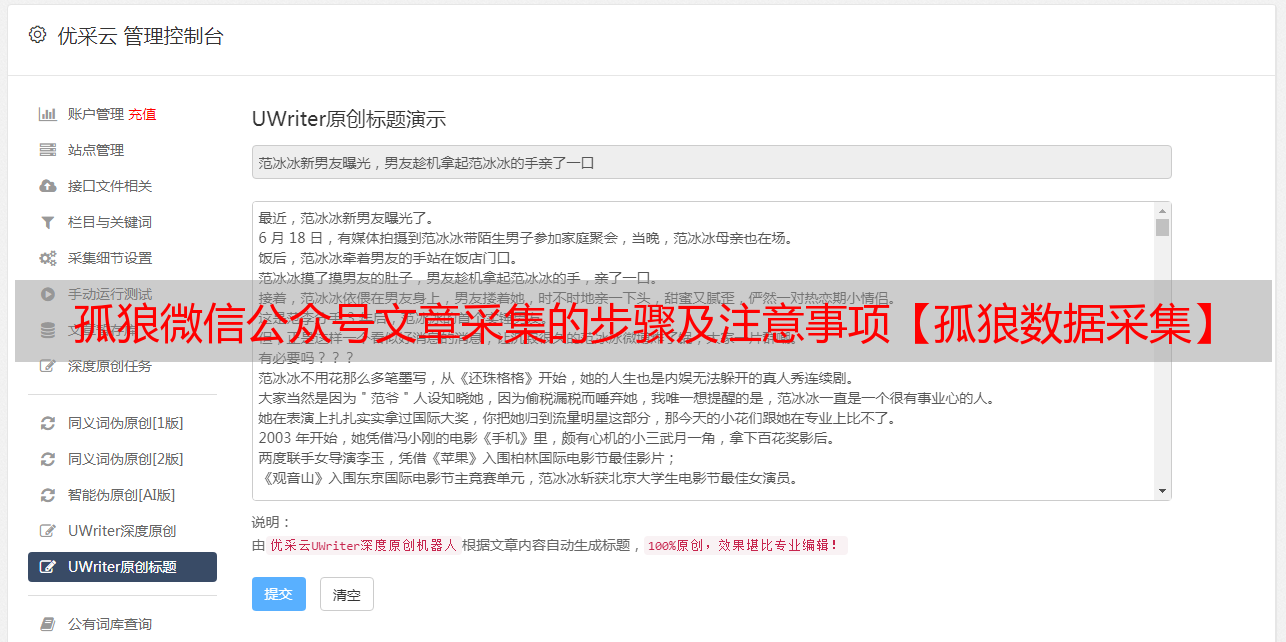 优采云 发布时间: 2021-03-21 21:24孤狼微信公众号文章采集的步骤及注意事项【孤狼数据采集】