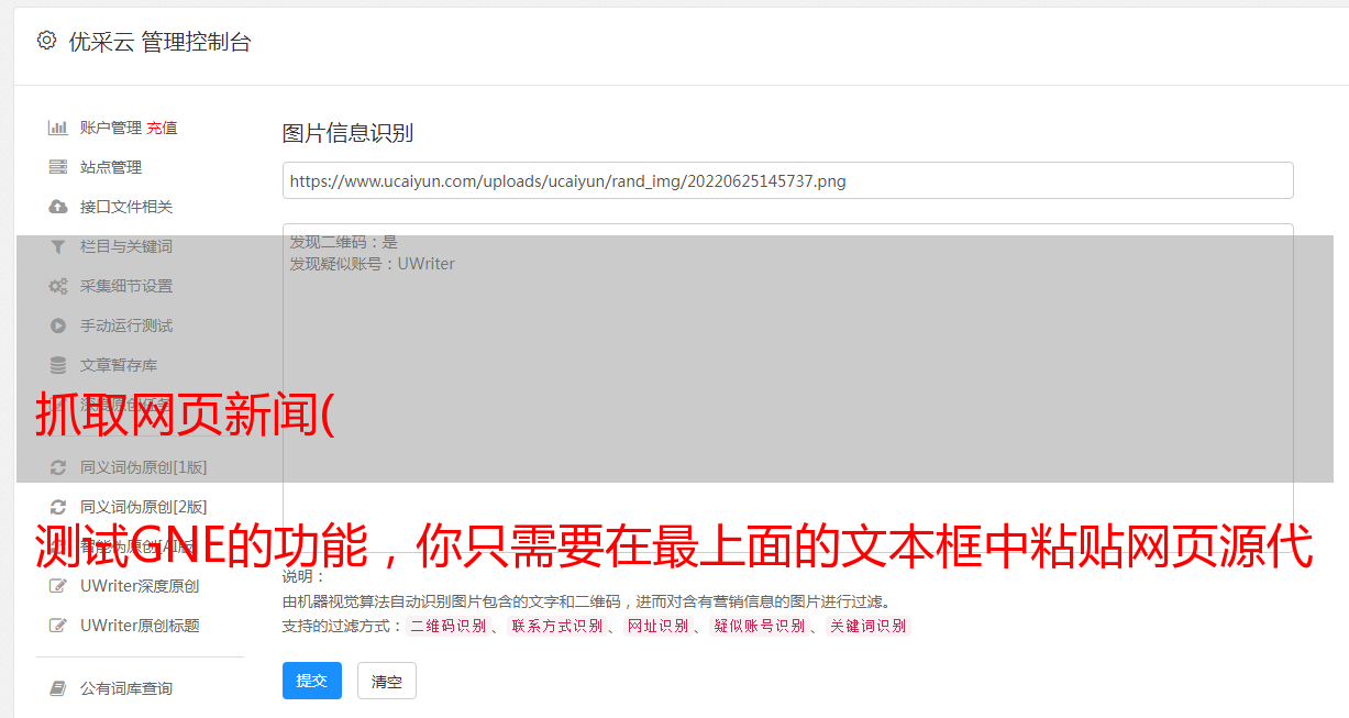 测试GNE的功能,只需将网页源代码粘贴到顶部文本框中,点击提取按钮即可: