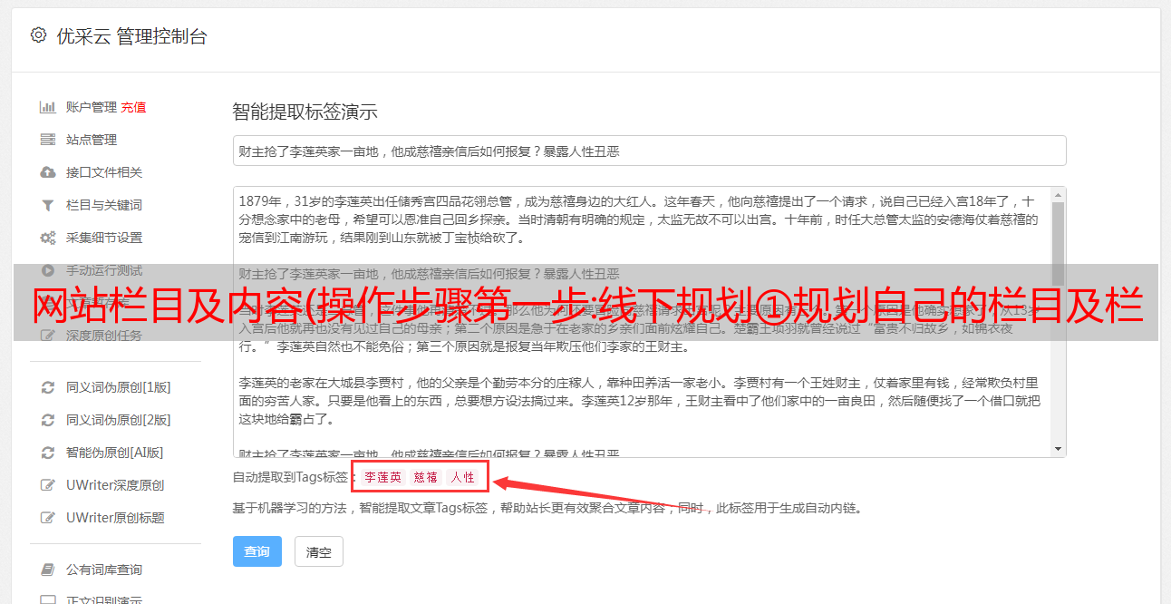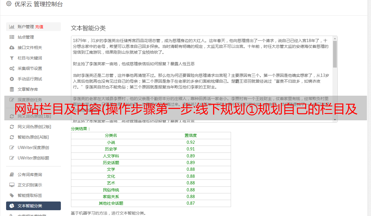 优采云 发布时间: 2021-11-07 09:04网站栏目及内容(操作步骤第一步:线下规划①规划自己的栏目及栏目类的分类)