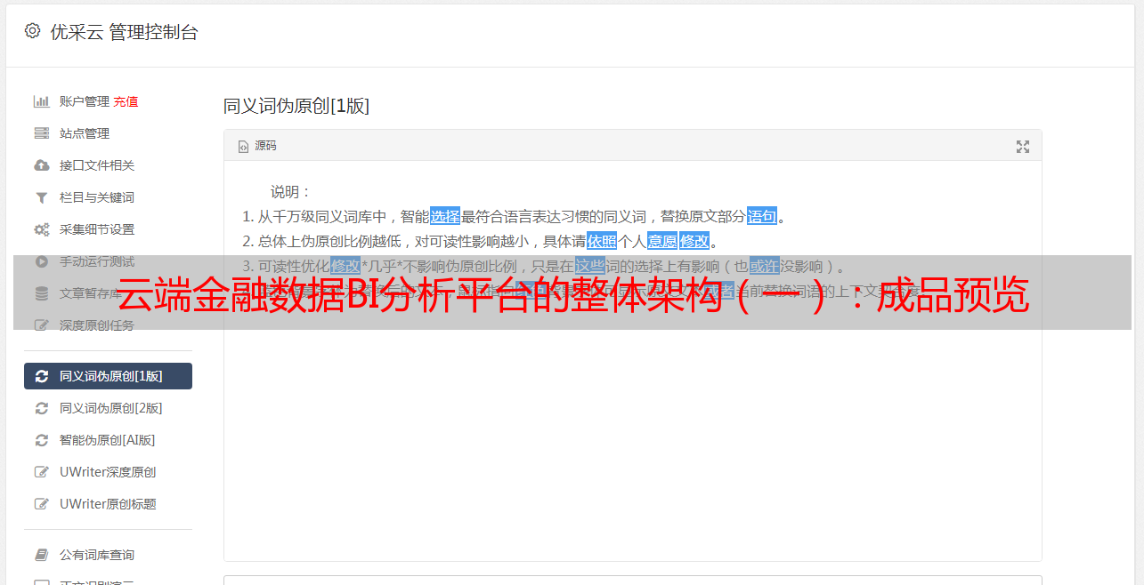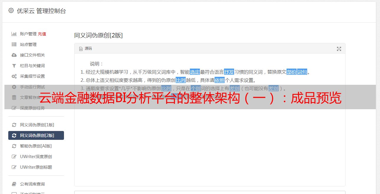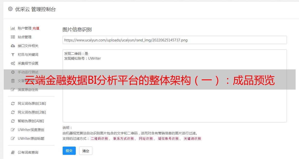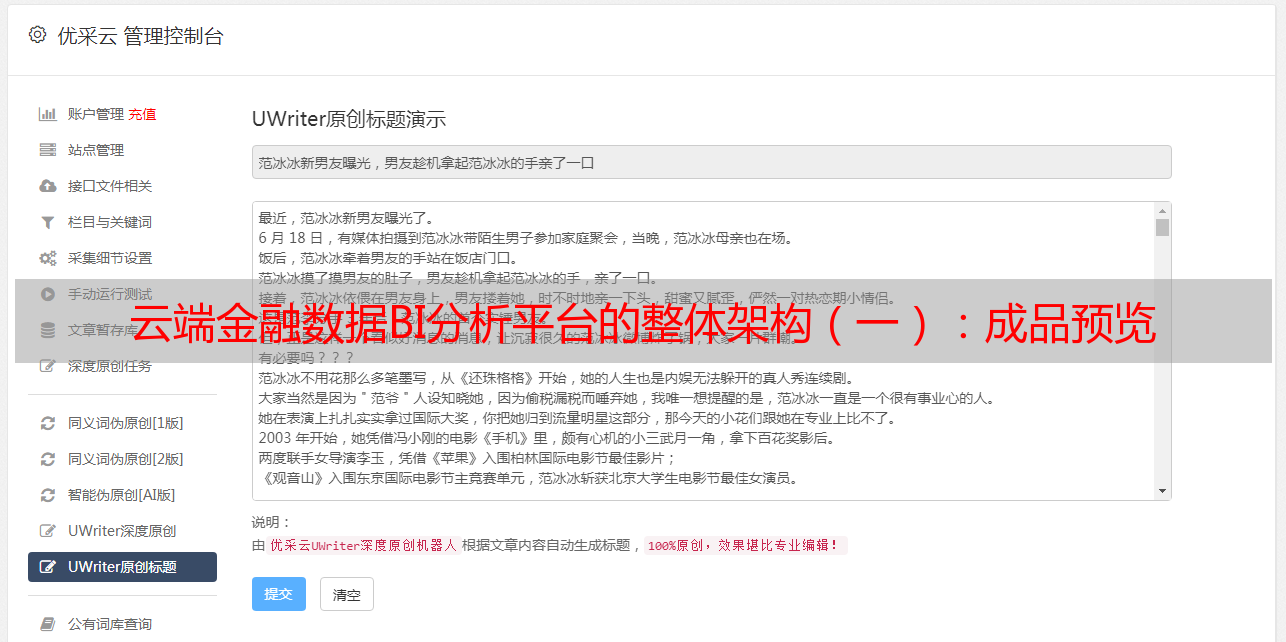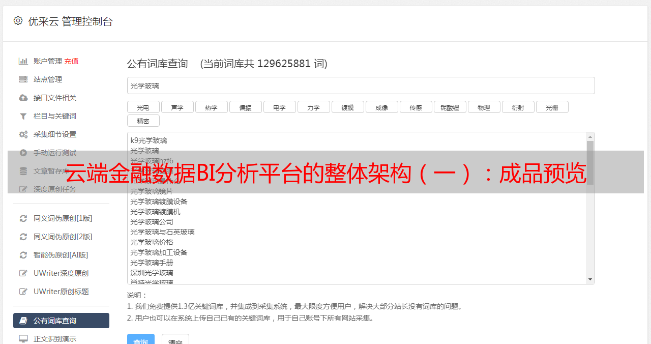 优采云 发布时间: 2021-03-27 01:46云端金融数据BI分析平台的整体架构(一):成品预览