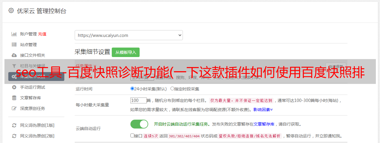 优采云 发布时间: 2021-11-09 14:05seo工具-百度快照诊断功能(一下这款插件如何使用百度快照排名优化的难易程度)