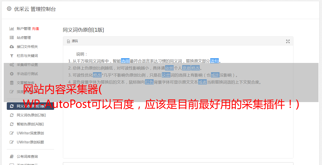 支持使用翻译引擎获取伪原创文章,不仅替换同义词,还重述语义,唯一性,伪原创更好,支持多种语言,完全免费。同时集成了WordAi等国外最好的伪原创工具,使得一个英文站可以获得更好的可读性和唯一性的伪原创文章。