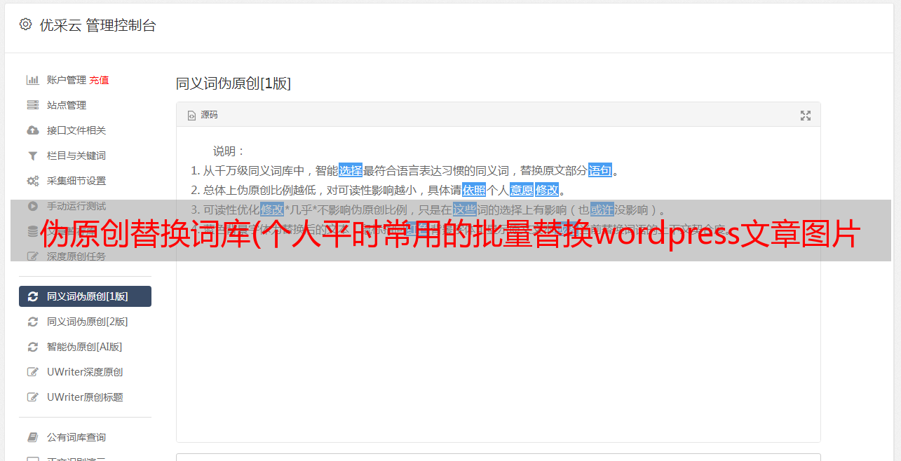 优采云 发布时间: 2021-11-10 23:11伪原创替换词库(个人平时常用的批量替换wordpress文章图片路径的方法!)