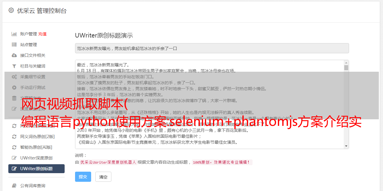 网页视频抓取脚本( 编程语言python使用方案:selenium+phantomjs方案介绍实现自动预览)