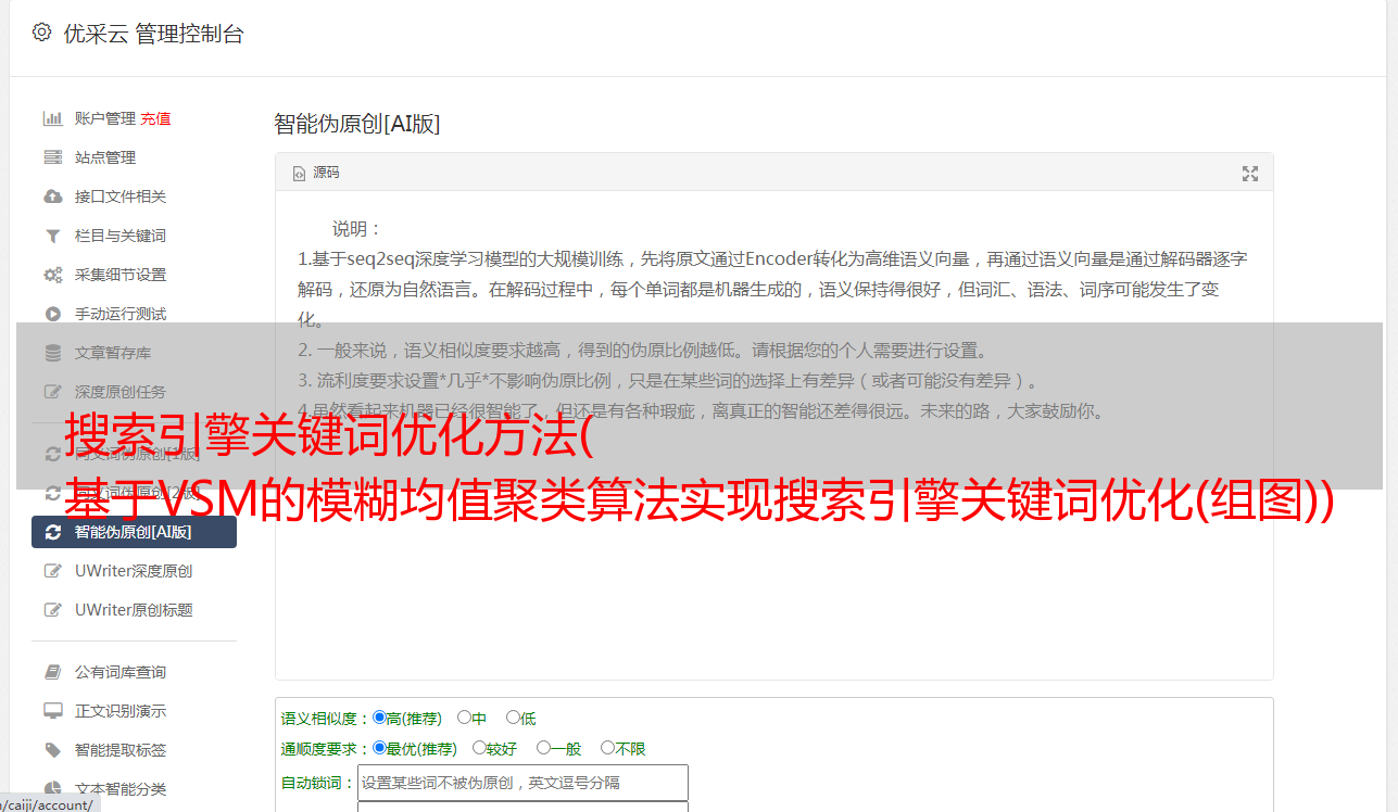 一家企业网站以其核心关键词在主流搜索引擎中排名第一。它在当今的商业社会中具有非凡的价值。因此,关键字通常被称为整个搜索应用程序的基石。目前,*敏*感*词*对关键词优化的理论研究和技术应用较多,但没有有效的方法来简化关键词的分析过程,也没有完善的机制来管理< @关键词 优化策略和时间表。基于上述需求,本发明提出一种基于VSM的模糊c-means聚类算法,实现搜索引擎关键词优化。
