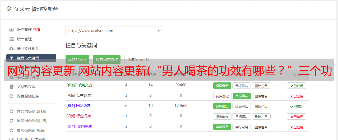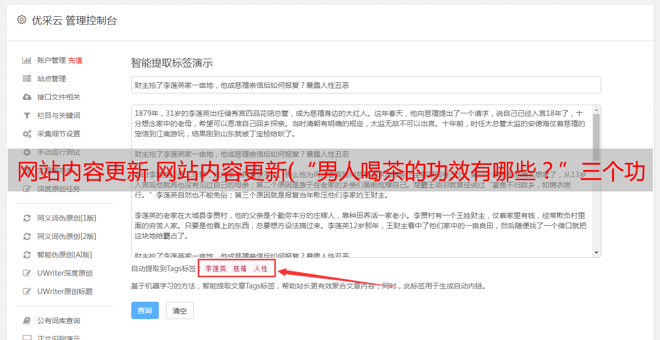 优采云 发布时间: 2021-11-16 12:17网站内容更新 网站内容更新(“男人喝茶的功效有哪些?”三个功效:排除体内毒素、补充所需营养品牌危机衡素材收集好了~