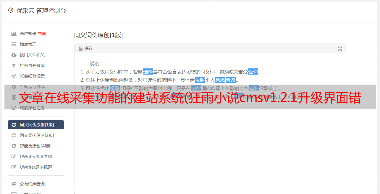 优采云 发布时间: 2021-11-17 08:05文章在线采集功能的建站系统(狂雨小说cmsv1.2.1升级界面错误后台工具增加执行)