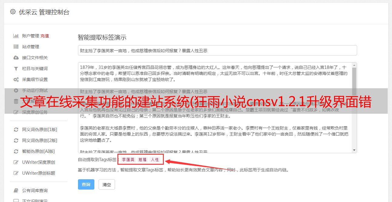 文章在线采集功能的建站系统(狂雨小说cmsv1.2.1升级界面错误后台工具增加执行)