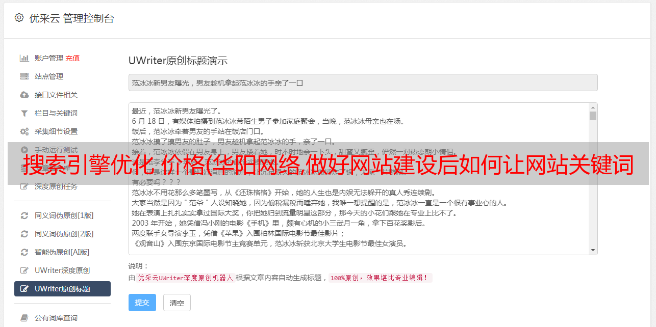 优采云 发布时间: 2021-11-18 02:07搜索引擎优化 价格(华阳网络,做好网站建设后如何让网站关键词排名迅速登上首页)