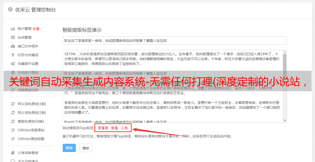 优采云 发布时间: 2021-11-19 06:19关键词自动采集生成内容系统-无需任何打理(深度定制的小说站,全自动采集各大小说站介绍