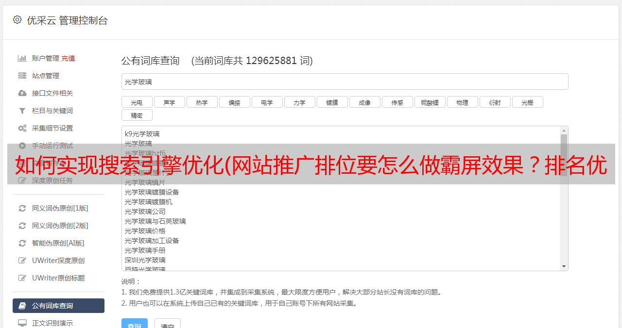 优采云 发布时间: 2021-11-20 09:19如何实现搜索引擎优化(网站推广排位要怎么做霸屏效果?排名优化技巧)