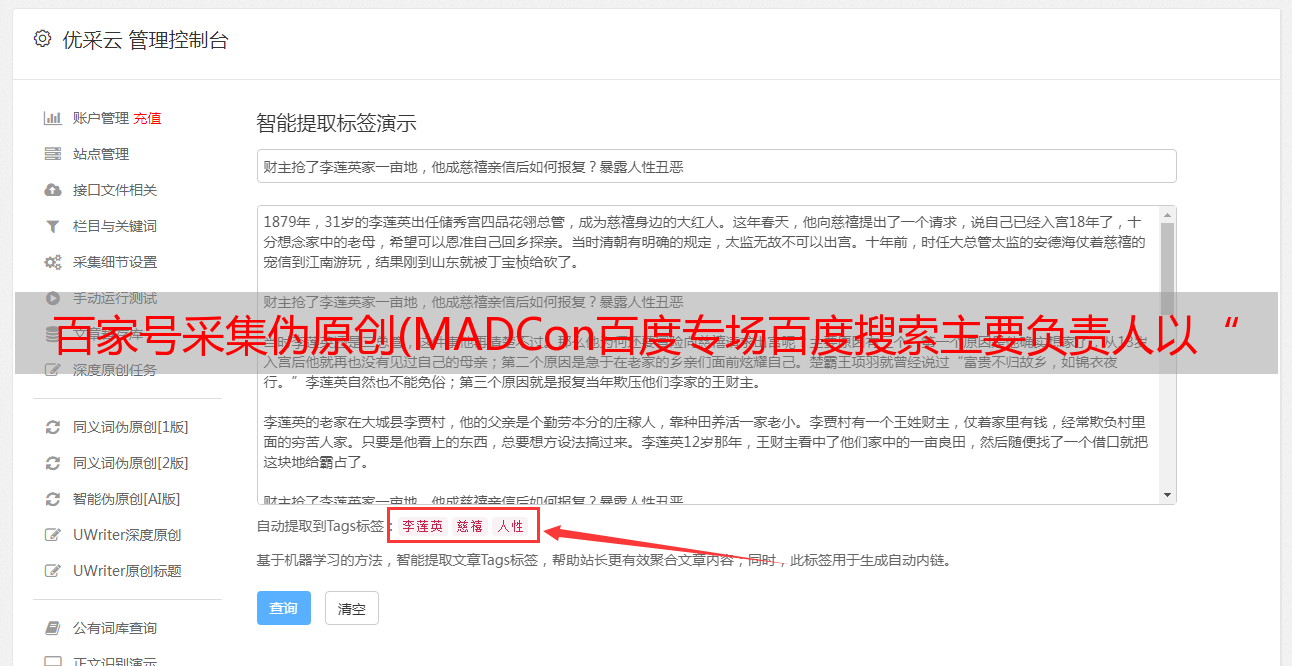 优采云 发布时间: 2021-11-20 11:02百家号采集伪原创(MADCon百度专场百度搜索主要负责人以“重塑搜索全新生态”)