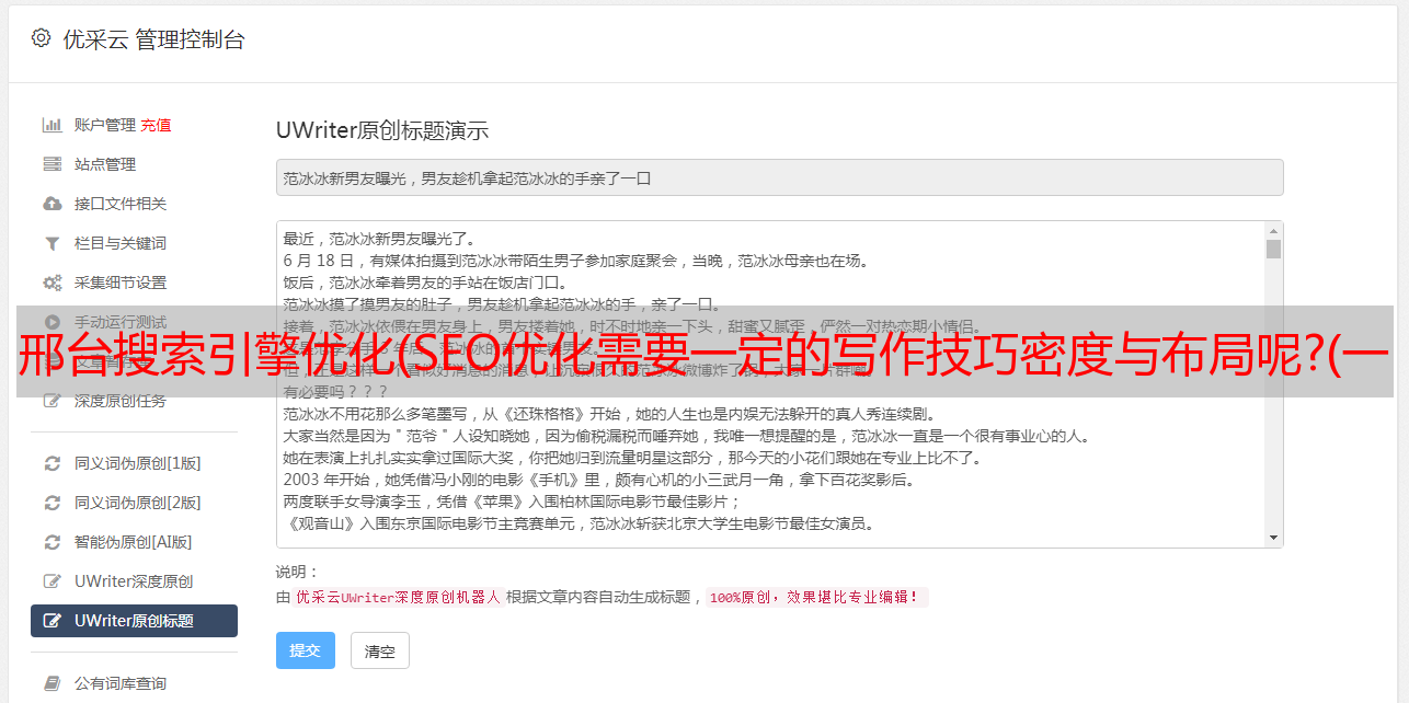 关键词优化需要一定的写作功底,但没有艺术性的需求。写完文章后,必须通过一定的技术手段去测试,了解它的原创率,判断文章在搜索引擎中收录的情况,这涉及到相关的back -端软件,可以每天导出收录费率。