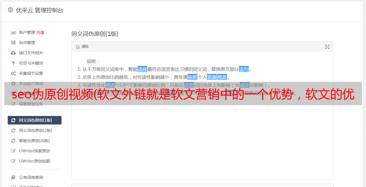 优采云 发布时间: 2021-11-24 14:06seo伪原创视频(软文外链就是软文营销中的一个优势,软文的优点)