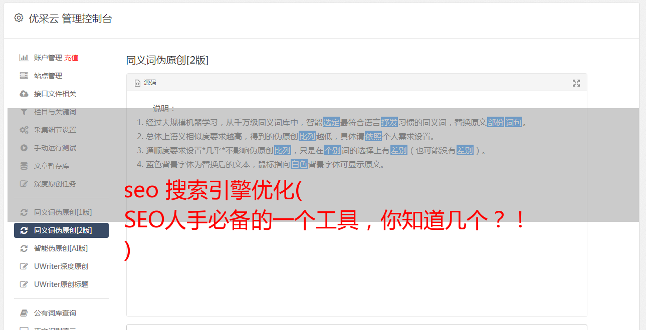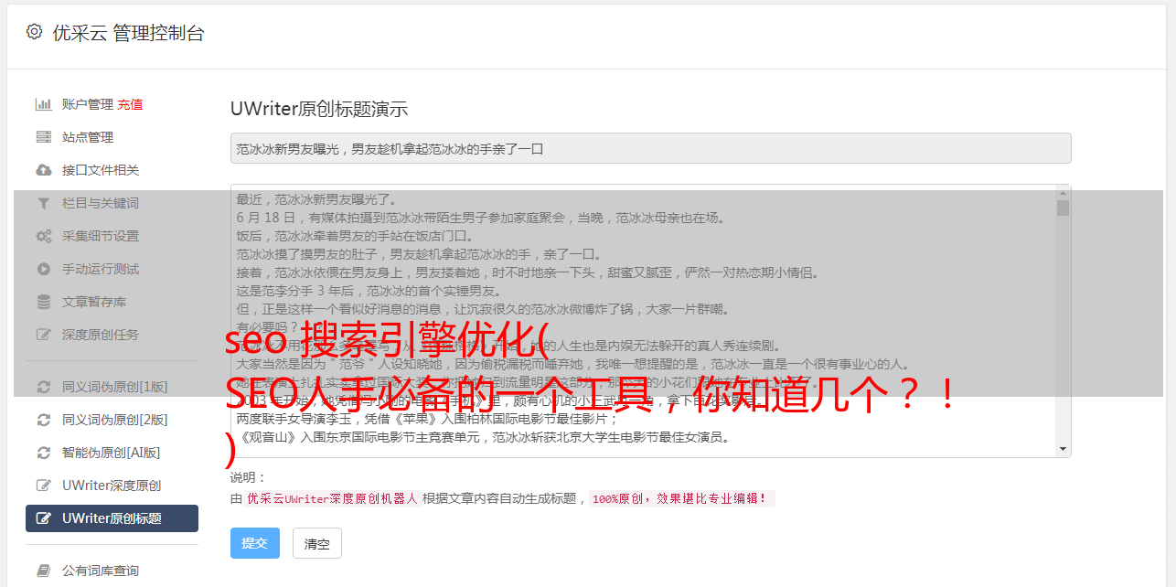 伪原创工具,伪原创的意思是重新处理原创的文章的一篇文章,让搜索引擎认为它是一篇文章原创文章 ,从而增加网站的权重。目前SEO的重点是内容,所有SEO都知道内容为王的原则。原则上高质量的原创文章对网站优化是最好的,但是原创文章太难了,所以更多的时候使用伪原创@ >. 伪原创 用于搜索引擎,适合采集类型的站长。