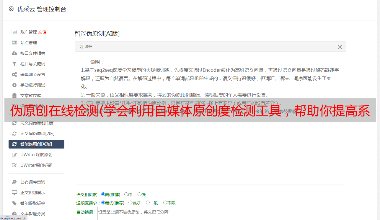 优采云 发布时间: 2021-11-27 00:14伪原创在线检测(学会利用自媒体原创度检测工具,帮助你提高系统推荐率)