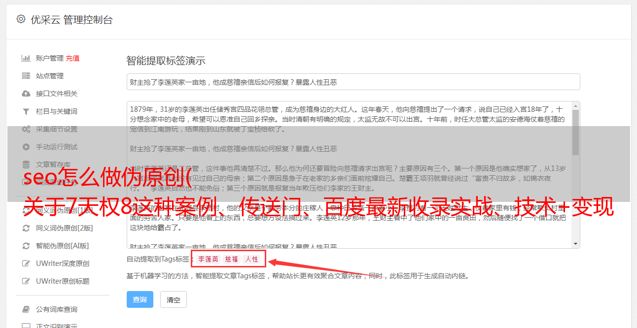 先说网站文章不用伪原创这块,那关于伪原创,在网上,各大seo群里,也有比较多的讨论。话题,毕竟网站还是靠文章吃饭,有没有文章可谈收录?毕竟,收录 越多,只要词库发布高,权重就越大。但是,如果我个人做一些文章,如果你手动复制粘贴,非常非常累人,而且速度也没有太大提升,所以很多大佬想到了采集软件,通过市面上的一些采集器比如优采云等等,有的大佬做了很多伪原创,有的有排名,有的没有,那你就分析一下是否需要做还是不做?