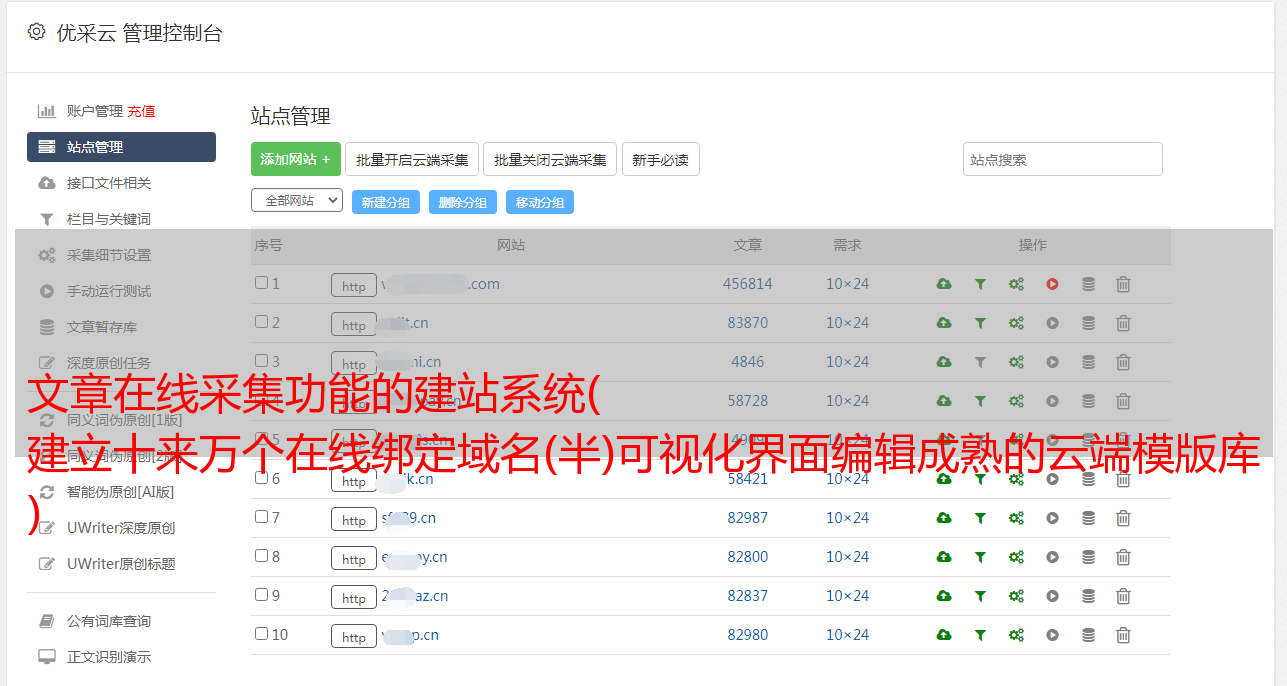 文章在线采集功能的建站系统( 建立十来万个在线绑定域名(半)可视化界面编辑成熟的云端模版库 )
