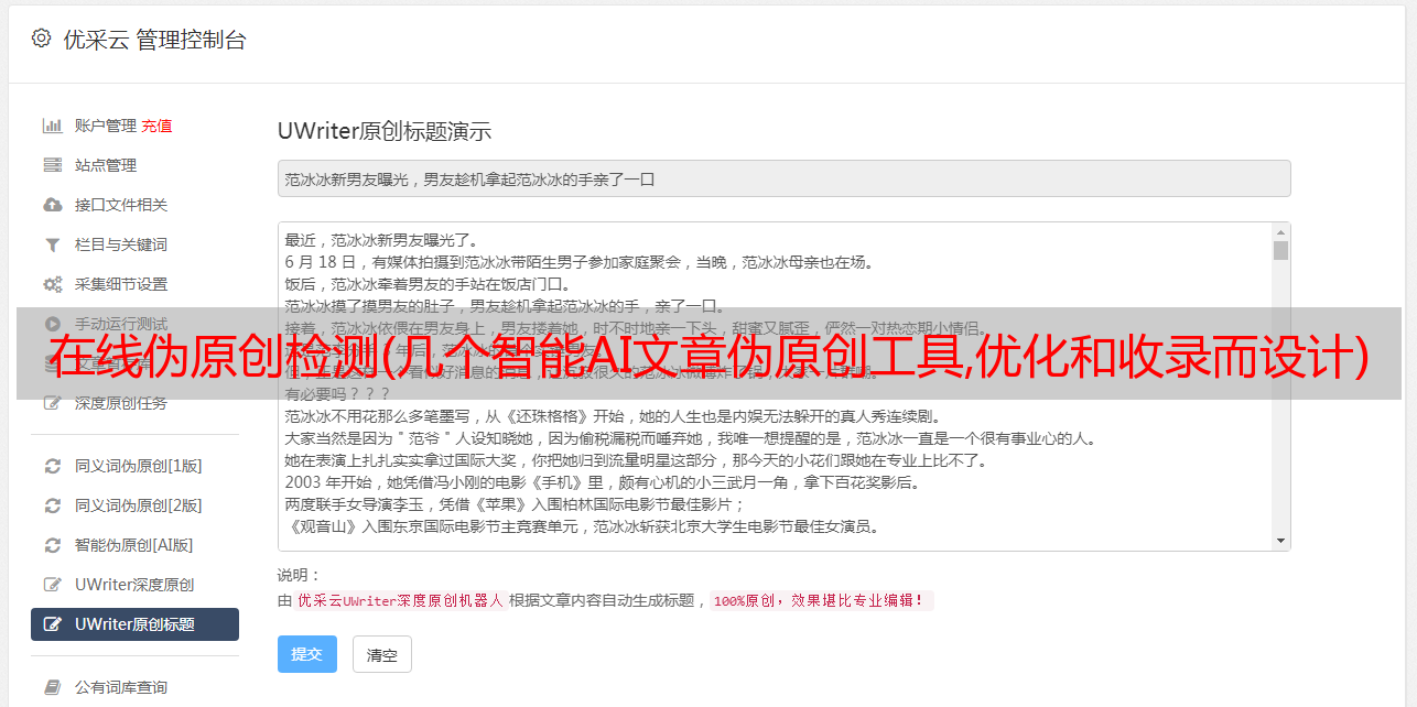 是专门为写原创、伪原创文章、软文而生成的在线工具,提供文章伪原创、AI伪原创对任何文章 进行在线原创 测试。