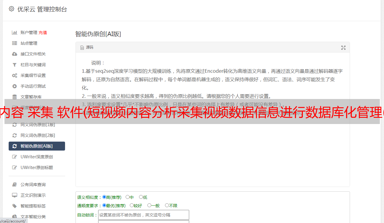 短视频内容分析采集管理软件是一款视频内容分析软件,可以对采集视频和采集的视频数据信息进行数据管理,对采集进行分析和分析。视频内容的内容管理。