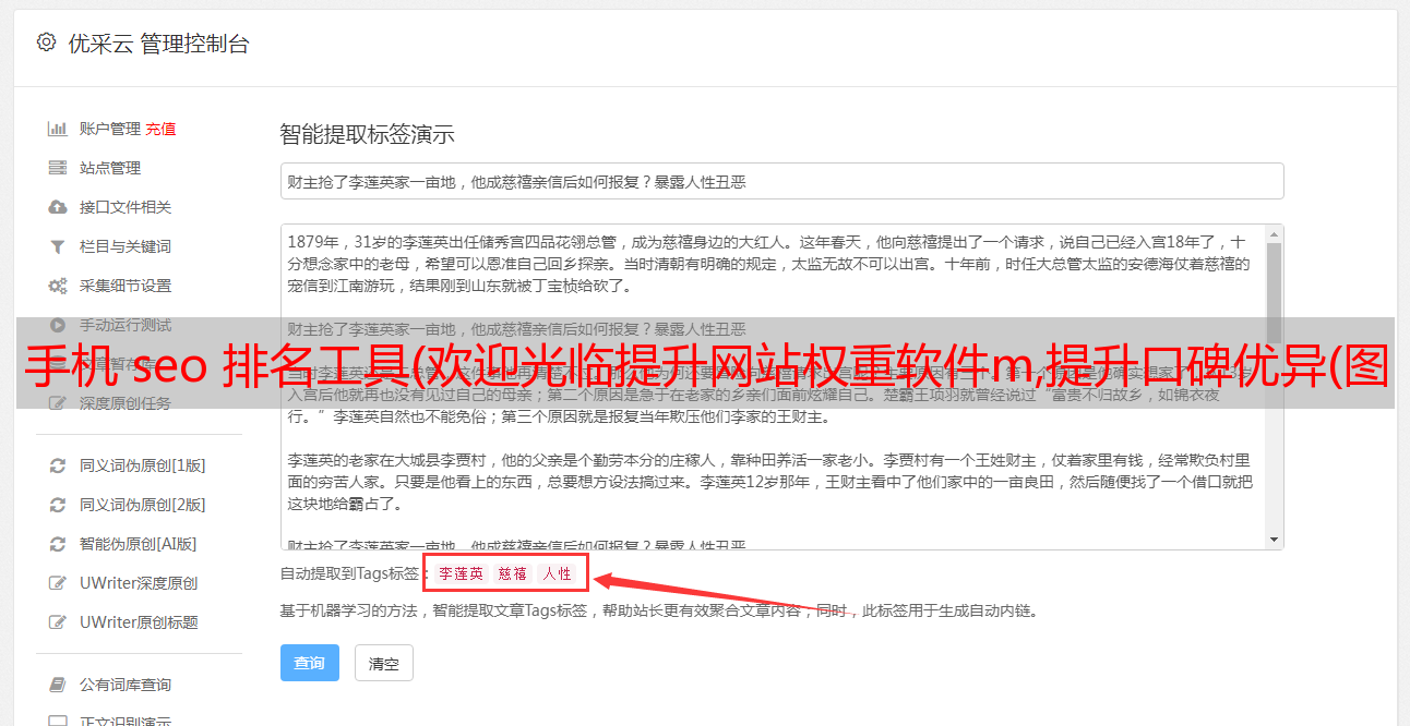 优采云 发布时间: 2021-12-04 06:21手机 seo 排名工具(欢迎光临提升网站权重软件m,提升口碑优异(图))