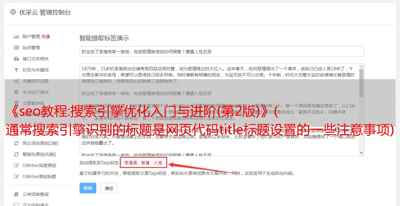 我们把文章的标题和搜索引擎的标题分开写,这样搜索引擎看到的标题就符合搜索引擎的条件,用户看到的标题和用户点击的标题党匹配用户。