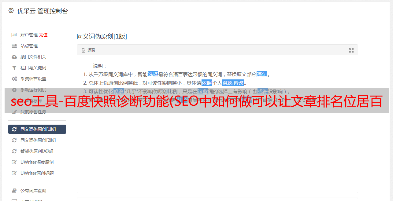 优采云 发布时间: 2021-12-06 11:01seo工具-百度快照诊断功能(SEO中如何做可以让文章排名位居百度首页呢?)