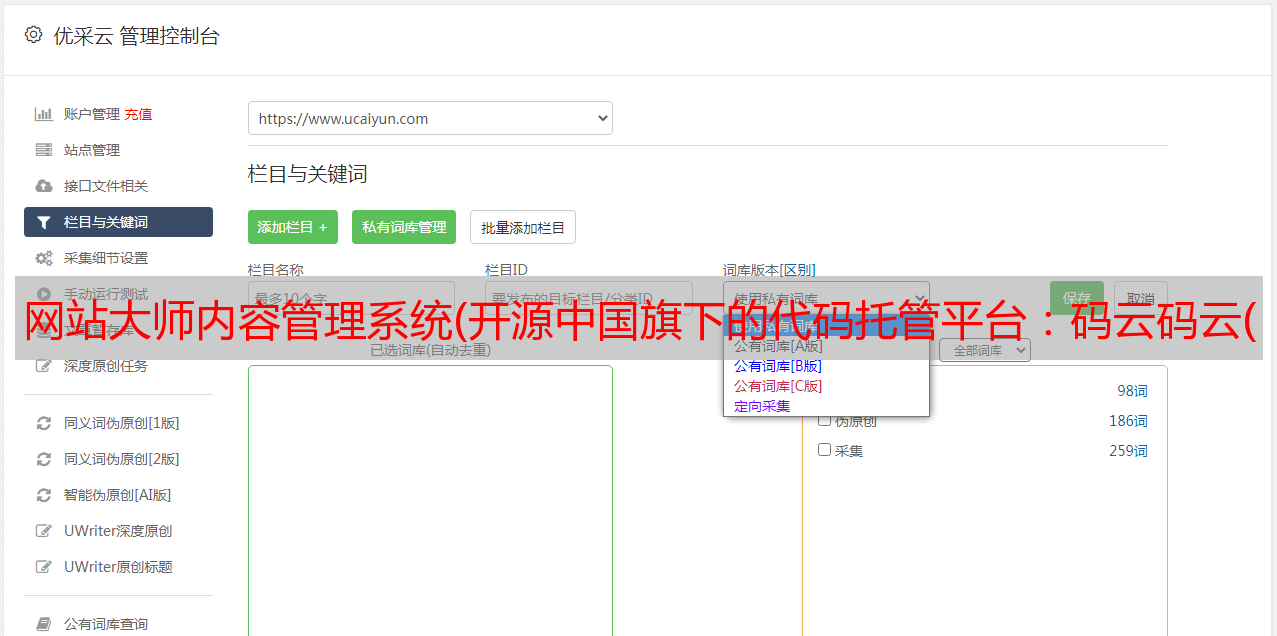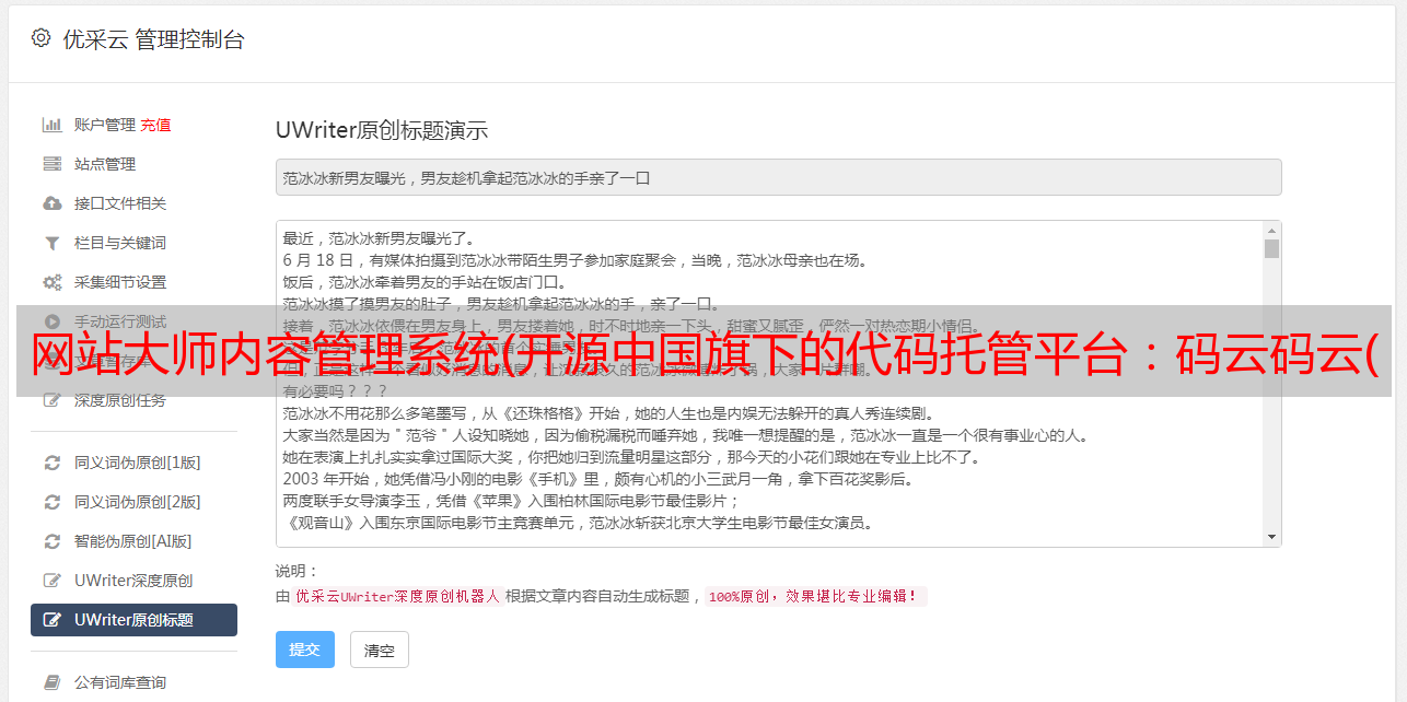 优采云 发布时间: 2021-12-08 06:21网站大师内容管理系统(开源中国旗下的代码托管平台:码云码云())