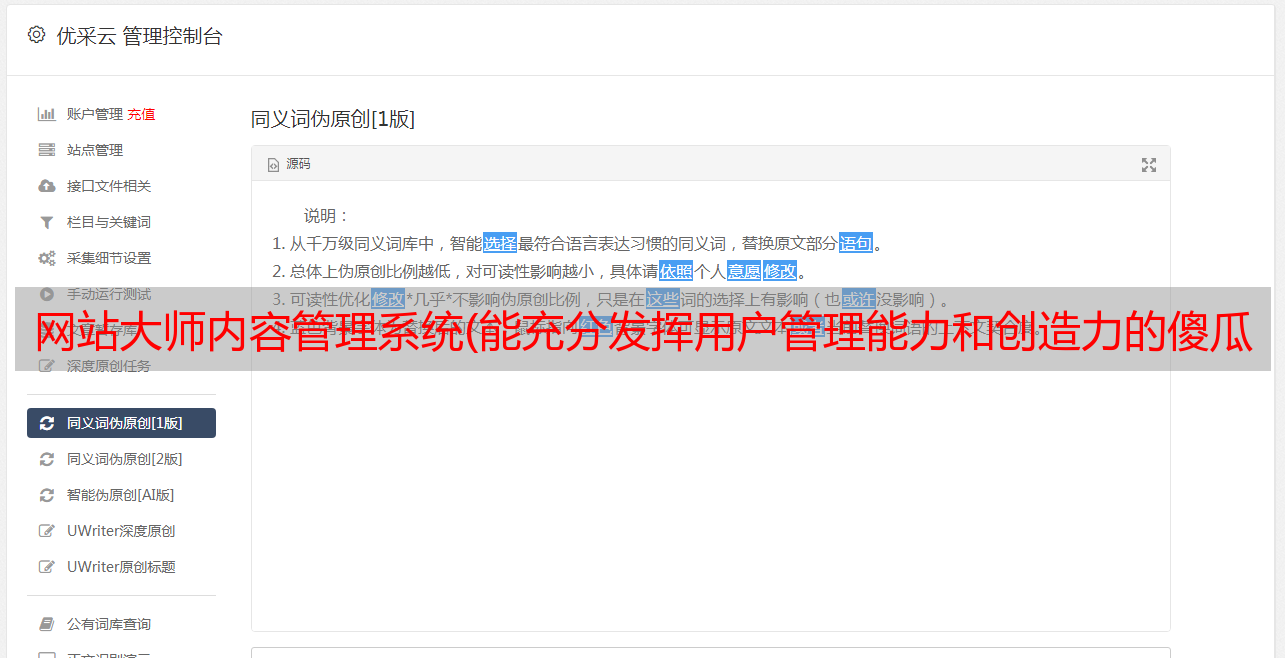 优采云 发布时间: 2021-12-09 17:12网站大师内容管理系统(能充分发挥用户管理能力和创造力的傻瓜式通用信息管理软件终身免费升级)