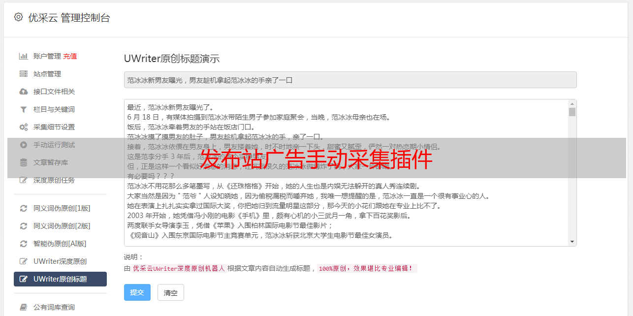 购买咨询请联系本站客服人员, 本采集插件插口对外开放, 不仅支持我们概念自己的发布站程序, 还可以支持其他的发布站程序, 不管是老程序还是新程序, 我们都可以编撰插口支持手动采集入库. 欢迎咨询.