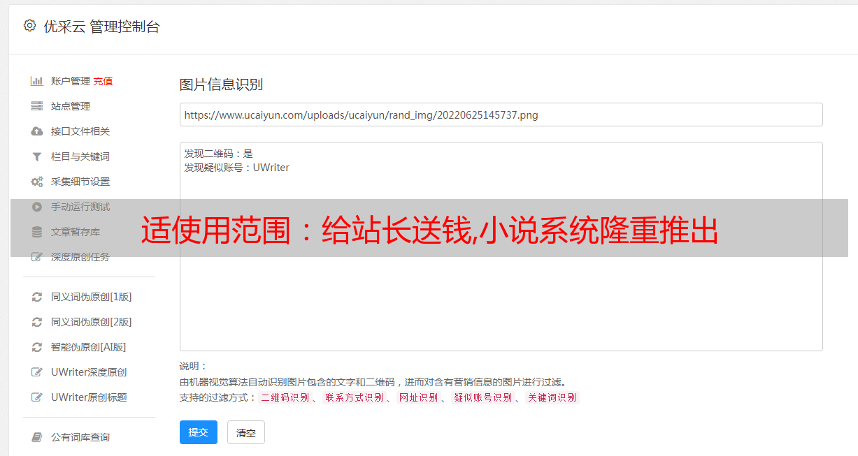 优采云 发布时间: 2021-04-05 18:14适使用范围:给站长送钱,小说系统隆重推出