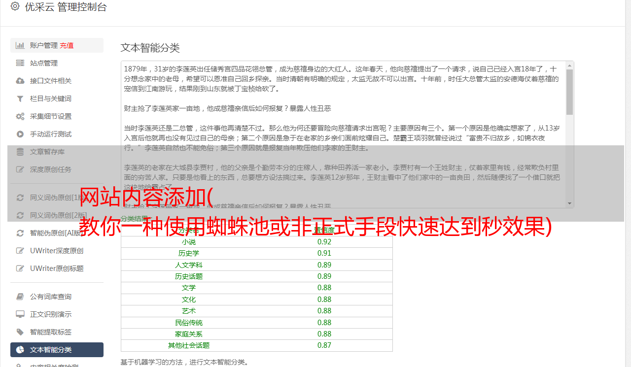 网站内容添加( 教你一种使用蜘蛛池或非正式手段快速达到秒效果)