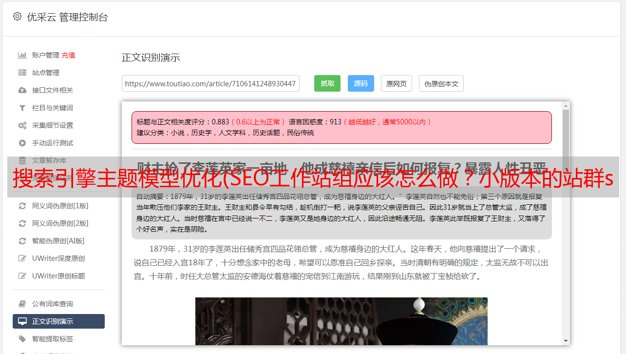 优采云 发布时间: 2021-12-20 16:17搜索引擎主题模型优化(SEO工作站组应该怎么做?小版本的站群seo)