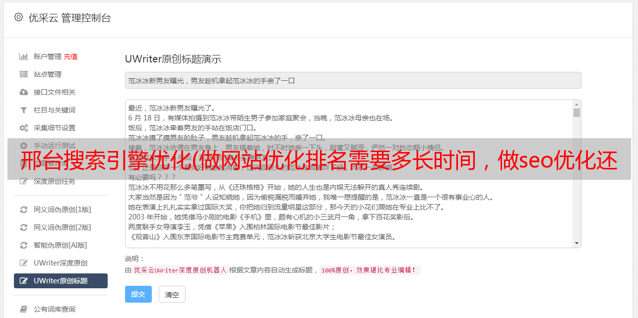 提高整个网站的权重,提高整个网站的质量。解决方案收录,快照的三个答案都不全面。SEO确实间接给你带来了网站上传文章网站的流量增加了网站的权重,网站需要填充文章,可以提高整个站点的质量,解决收录,快照问题,但如果只从这个角度更新文章,那至少你的出发点是错误的。