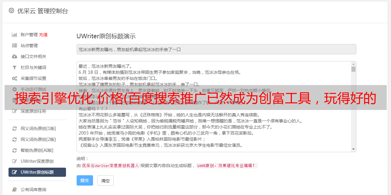 优采云 发布时间: 2021-12-25 13:06搜索引擎优化 价格(百度搜索推广已然成为创富工具,玩得好的诸如我们的一些客户)