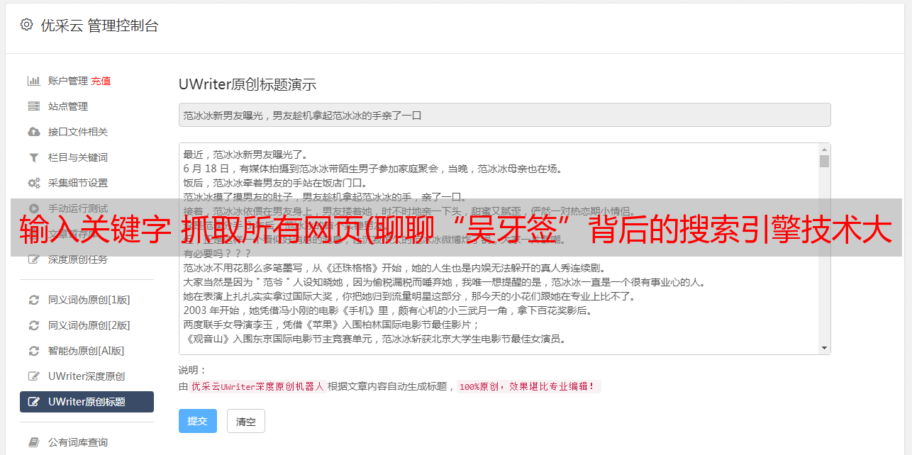 例如,某作者写了一篇与“吴牙签”相关的文章发布到某个写作平台上,网络蜘蛛就可以通过这个写作平台将这篇文章抓取到自己的网络数据库中。