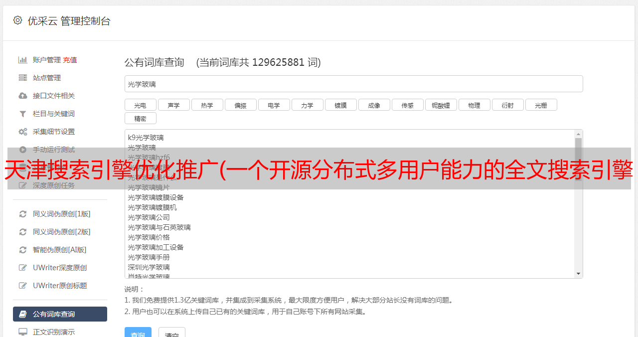 优采云 发布时间: 2021-12-29 16:11天津搜索引擎优化推广(一个开源分布式多用户能力的全文搜索引擎