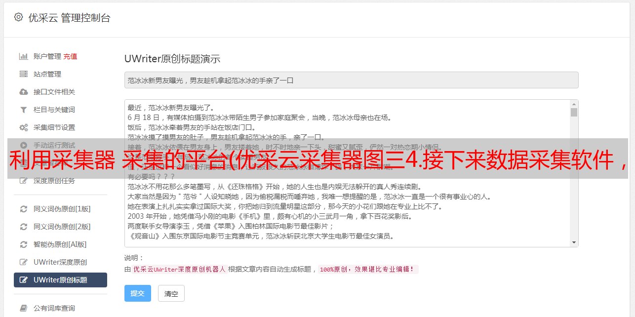 优采云采集器是一款非常专业的互联网数据采集、处理、分析、挖掘软件。通过使用该软件,可以更灵活、快速地抓取大量非结构化网页的文字、图片等信息,通过席勒的分析处理技术,我们可以更准确地挖掘出需要的数据。是目前最流行的网页数据采集软件。