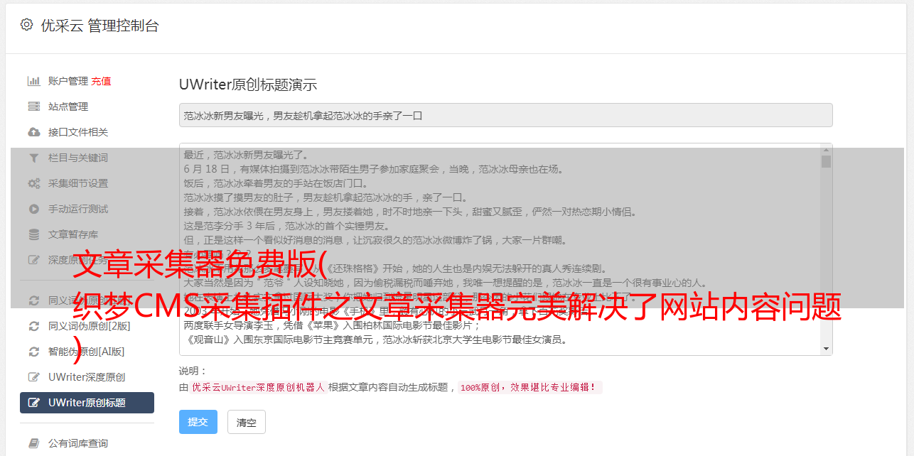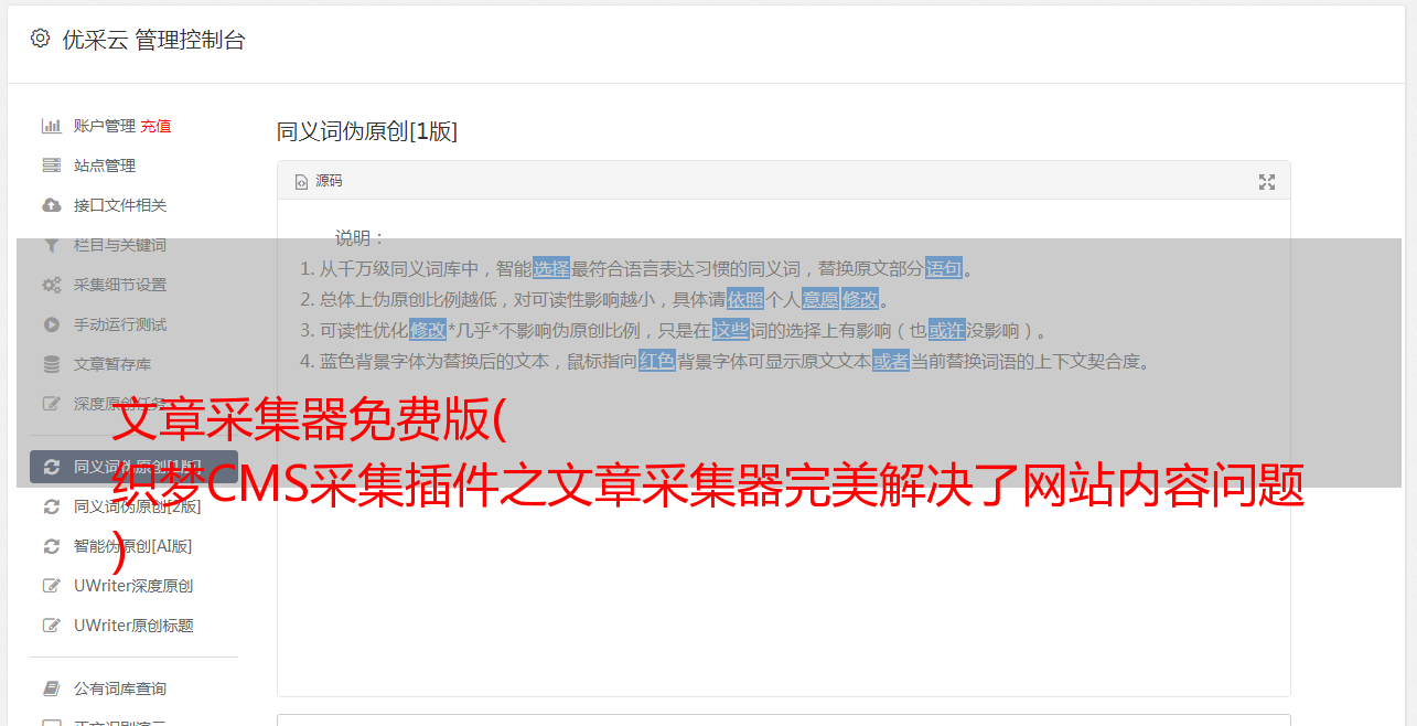 多种伪原创和优化方法提高收录率和关键词排名:自动标题、段落重排、高级混淆、自动内链、内容过滤、URL过滤和同义词替换和其他提升采集文章原创性能、提升搜索引擎收录、网站权重和关键词排名的方法。