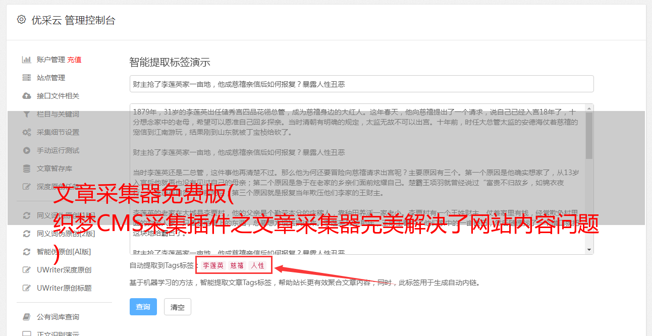 织梦cms采集文章采集器的插件基于织梦DEDEcms网站 < @采集和站群采集,可以根据关键词,RSS和页面监控方式采集,伪原创SEO优化和更新发布,定期量化,无需写采集规则! 织梦cms采集文章采集器的规则不知道大家有没有明白,可能有的站长没接触过吧! 采集工具一般用于网站内容填充或者一些站群或者大型门户网站。企业站点也被使用。当然,有些个人站点也被别人使用采集,因为有些情况下我不想自己更新文章,或者大站点需要更新文章很多和复杂的,比如新闻网站,都用采集。